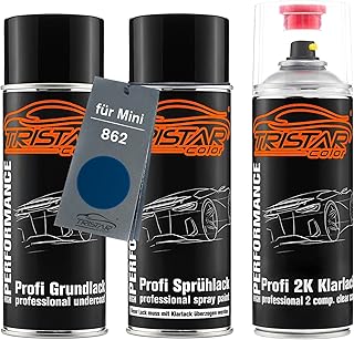 TRISTARcolor Autolack 2K Spraydosen Set für Mini 862 Indi Blue Metallic/Laser Blue 2 Metallic Grundlack Basislack 2 Komponenten Klarlack Sprühdose