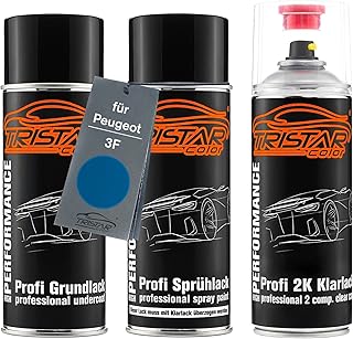 TRISTARcolor Autolack 2K Spraydosen Set für Peugeot 3F Bleu Recife Metallic/Aegean Blue Metallic Grundlack Basislack 2 Komponenten Klarlack Sprühdose