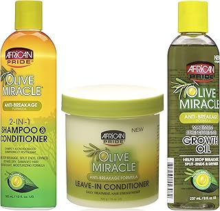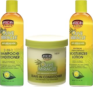 African Pride Olive Miracle | 3er-Set gegen Haarbruch | 2-in-1 Shampoo und Spülung, 355 ml | Leave-In-Spülung, 425 g | Feuchtigkeitsspendende Lotion für maximal gekräftigtes Haar, 355 ml
