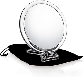 Fantasia Reisespiegel Acryl klappbar: Doppelseitiger Makeup Spiegel mit 10-fach Vergrößerung, Kosmetikspiegel mit Griff, Make Up Spiegel klein mit Geschenk Etui aus Samt - Taschenspiegel klar - 16cm
